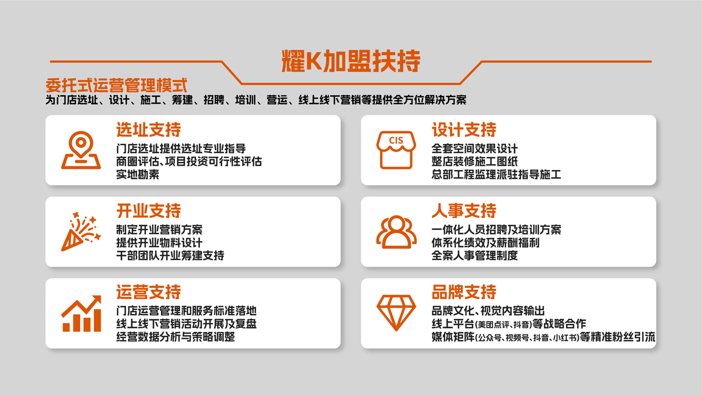 为门店选址、设计、施工、筹建、招聘、培训、营运、线上线下营销等提供全方位解决方案。